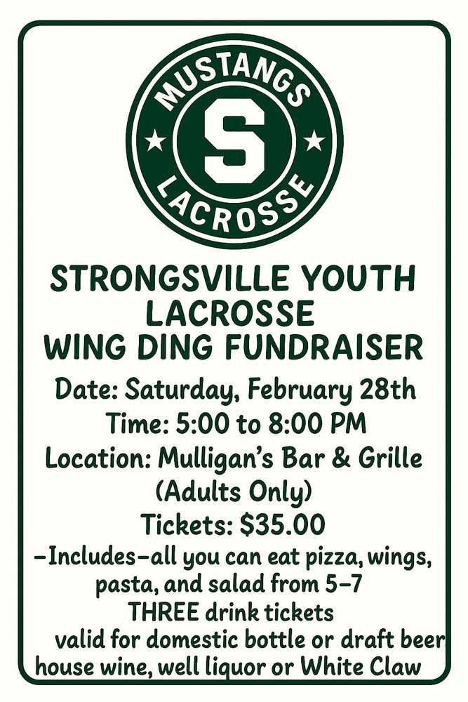 Join us for a night of delicious wings, camaraderie, and supporting Strongsville Lacrosse! This fundraiser is a fantastic opportunity to meet fellow lacrosse families, enjoy mouth-watering food, and contribute to a great cause. Proceeds from the event will go directly to enhancing our program and providing the best experience for our young athletes.